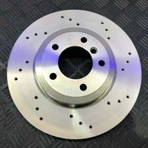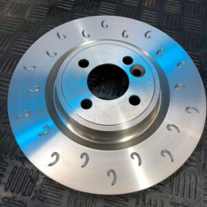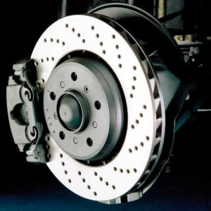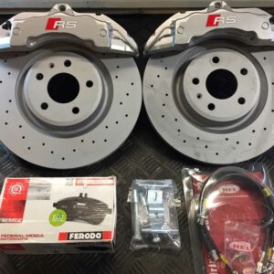 Un kit completo de mejora de frenos delanteros de alto rendimiento que incluye dos discos de acero perforados, pastillas de freno de alto rendimiento, latiguillo de freno de acero inoxidable trenzado, tornillería de montaje y pinzas distintivas con la marca "RS". Diseñado para una mayor potencia de frenado, disipación de calor y estilo, perfecto para modelos deportivos Audi o Volkswagen RS.